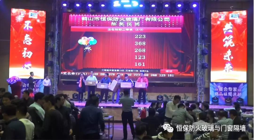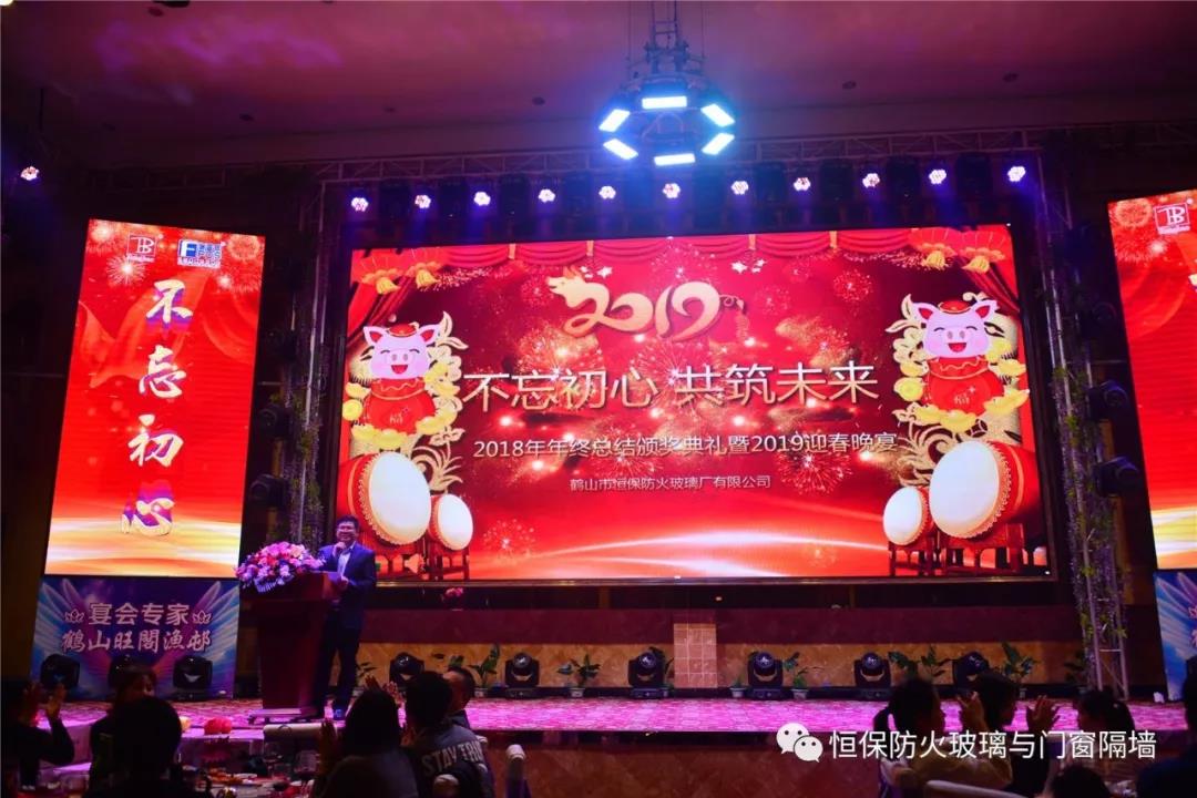 19:30分,恒保年會在鼓舞飛揚中拉開了帷幕,首先是恒保總經理陳沃林先生做年終致辭,陳總回顧了2018年所取得的成績與不足,并提出了2019年恒保要全力以赴,不忘初心,繼續奮斗,再創佳績的戰略方針。2018年是恒保跨越發展的一年。全體恒保家人,團結一心,艱苦奮斗,全力實現了公司既定的年度目標,同比各項重要指標增長逾80%。2018年我們大力引進新設備,開發新產品10多項,產品通過國家檢測20多項 ,至此,恒保出品已擁有37個3C認證,158份檢驗報告,成為行業內公認通過國家檢驗、認證最多的防火玻璃門窗企業;2018年在行業各類權威獎項評比中,榮獲“全國鋁門窗幕墻展 年度星品獎”、榮獲“新玻網 門窗玻璃十強企業”、陳沃林總經理榮獲鶴山市工商聯系統“工匠之星”稱號、陳沃林總經理榮獲第五屆中國玻璃行業“玻璃工匠”稱號、榮獲第三屆建筑門窗金軒獎“最具創新力配套產品”、榮獲第三屆建筑門窗金軒獎“最具發展潛力企業”、榮獲中國門窗幕墻行業“科技進步推動獎”等十多項獎項。2019年我們將持續優化各部門管理,提高員工工作技能、提高生產管理水平、提高生產效率、提高綜合管理能力,減少物料損耗,減少出錯率。加強精密型材、新型防火門窗的開發,滿足不同客戶的需求。2019年恒保上下一心、同心協力、不忘初心,共筑未來,為實現中國平安夢、世界平安夢繼續奮斗!