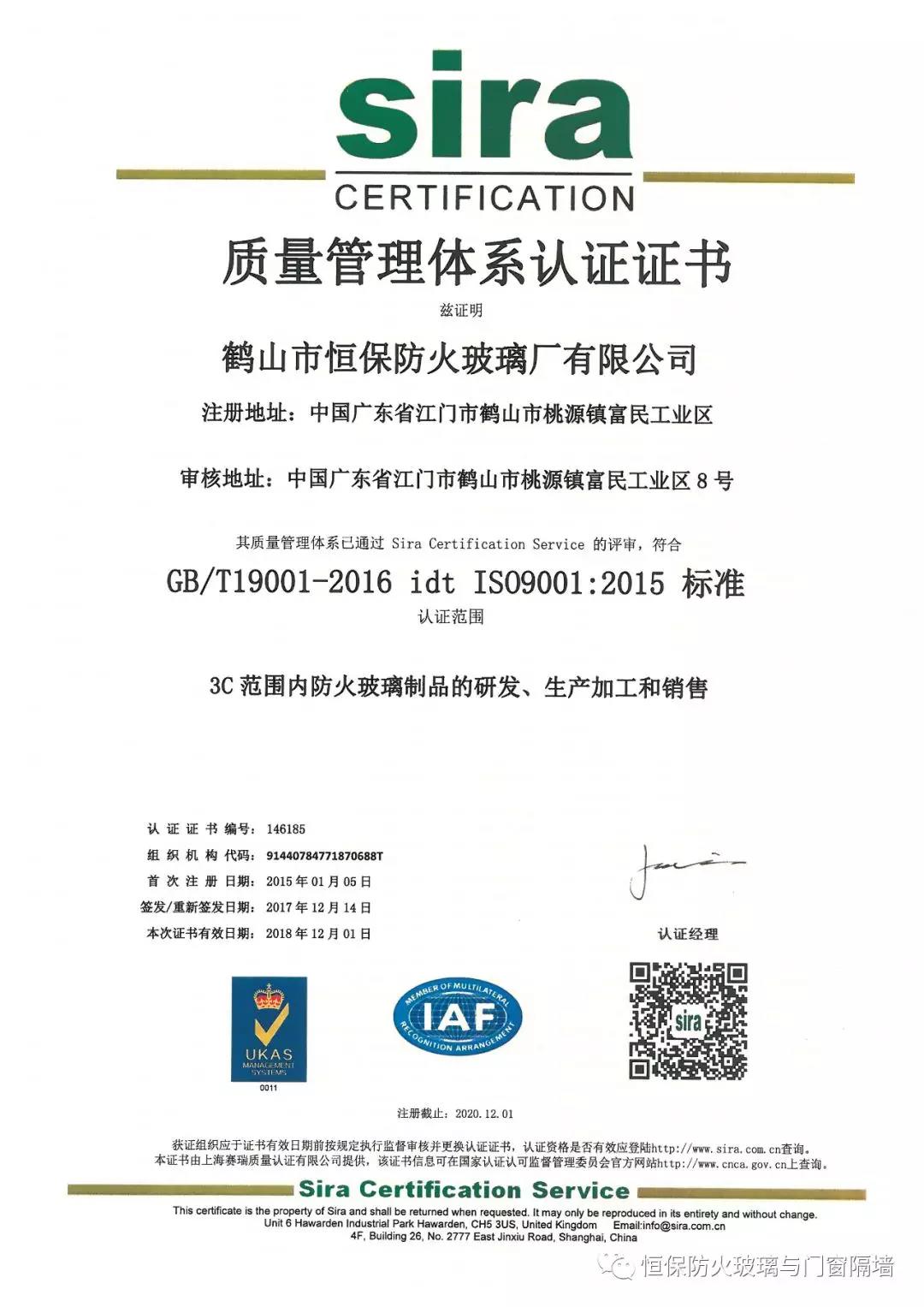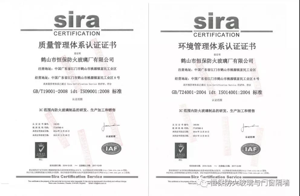 鶴山市恒保防火玻璃廠有限公司,自2014年第一次獲得ISO9001-2008質量管理體系、ISO14001-2008環境管理體系認證。并與原企業管理體系相結合,與CCC強制性認證產品企業管理體系相融合,建立了更完善的科研、開發、生產、銷售和售后服務體系,使恒保公司穩健快速增長。